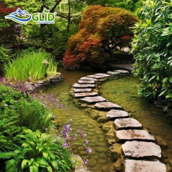 Gia chủ cảm thấy thế nào về lối đi như trong hình trên.Thay vì xây cầu băng qua hồ nước, hồ koi , gia chủ có thể tạo lối đi bằng đá sát gần mặt nước. Đây là kiểu lối đi thiết kế khá mới nhưng lại rất thường gặp trong tự nhiên. Lối đi này tạo ra điểm nhấn rất đặc biệt làm nổi bất khoang không gian nước của sân vườn.